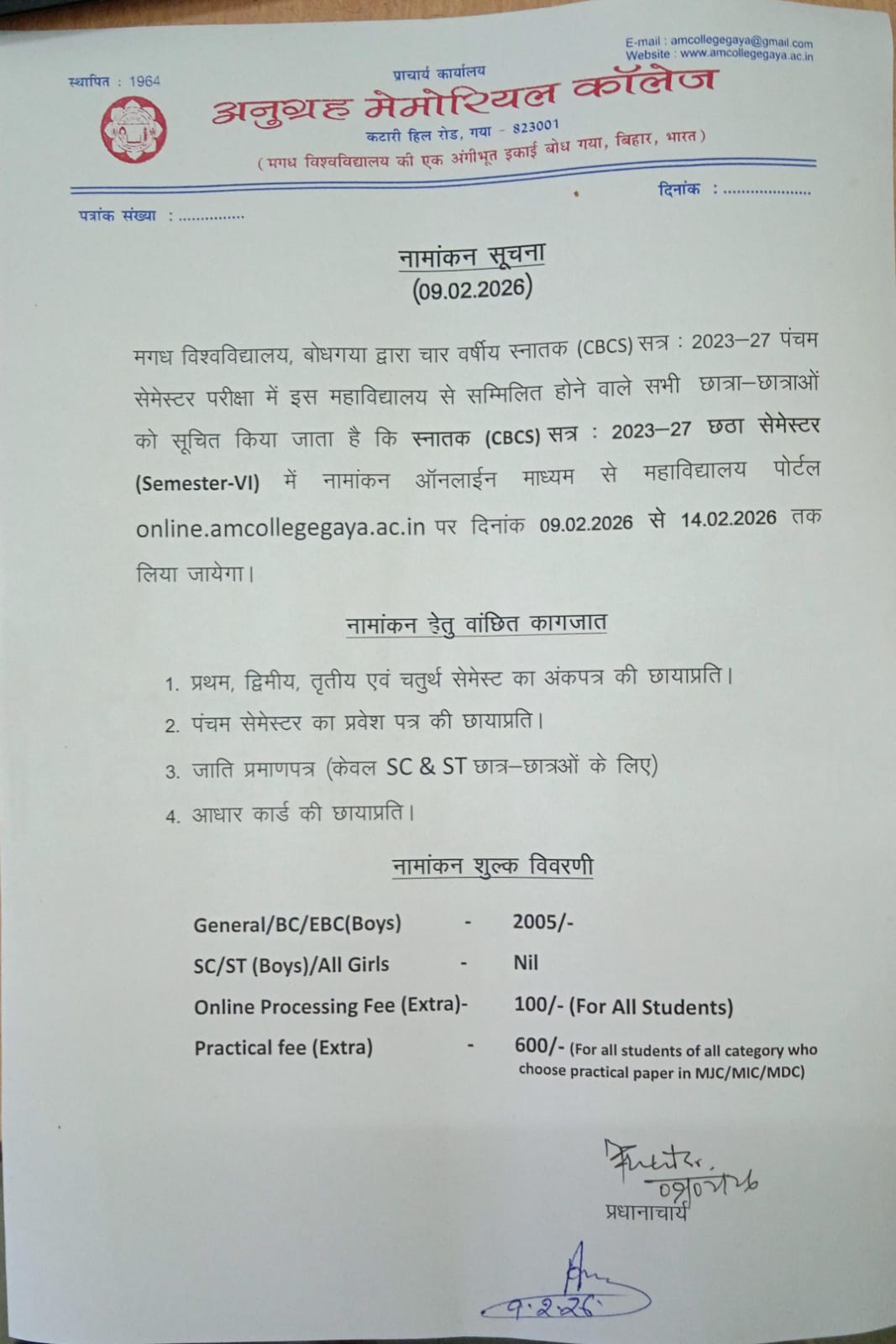 NOTICE REGARDING FOR ADMISSION 6TH SEMESTER (2023-27)